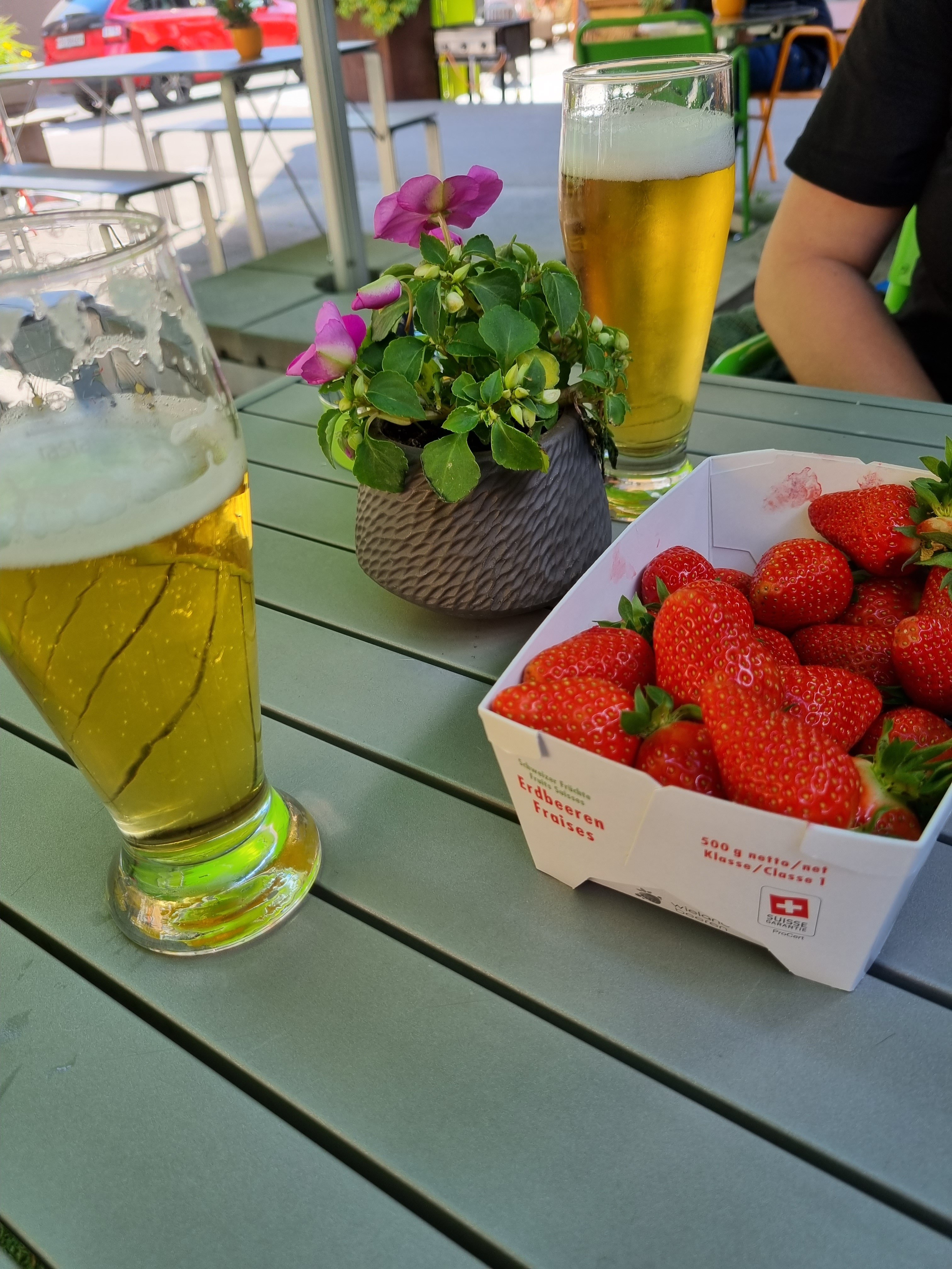 Heute ist Tag eins unserer diesjährigen Pilger Wanderung. Ich sitze hier im Café in der Schweiz mit müden Gliedern und ein paar schmerzenden Körperteilen, bin aber zufrieden und innerlich ruhig. Die erste Etappe ist in ein paar Kilometern geschafft! Aber nun gibt es erst mal Bier und Erdbeeren! Prost!